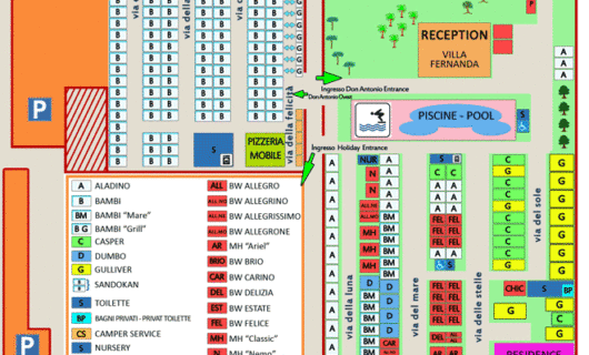 De camping heeft een oppervlakte van 50.000 m2. Een groot aantal kampeerplaatsen is voorzien van drinkwater en afvoer voor vervuild water. Het gebruik van een privé-toilet is mogelijk. Ook aan gehandicapte mensen is gedacht, de vakantiehuisjes Felice zijn aangepast aan gasten met een rolstoel, en een speciale rolstoel laat toe dat ze gebruik kunnen maken van het zwembad.