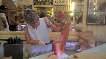 Omdat we rond lunchtijd in de trein zouden zitten, had ik afgesproken om bij een Salumeria o.i.d. nog even voor elk een vers broodje te halen. Ik haalde dat bij een leuk en fotogeniek zaakje, La Buca, waar ik kon kiezen uit allerlei soorten rauwe ham en enkele andere soorten vleeswaren (waaronder wild Zwijn). De plakken prosciutto crudo werden ter plekke met een groot mes, afgesneden van een enorme ham, voor mij al een bezienswaardigheid op zich en eveneens een fotomomentje waard. Twee broodjes net gesneden crudo…verser krijg je het niet!