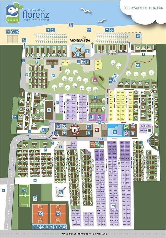 Holiday Village Florenz biedt u een verschillende verblijfsmogelijkheden. U heeft de keuze uit het huren van een stenen bungalow, stacaravan of een caravan. Het is ook mogelijk om uw caravan te plaatsen aan het strand, zodat u een perfecte verblijfplaats heeft. De pijnbomen zorgen voor schaduw en verkoeling. Er hangt een fijne sfeer op deze familiecamping.
