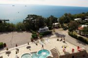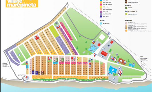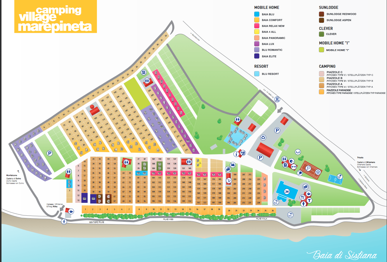 De ligging van Camping Mare Pineta Baia Sistiana is uniek, omdat het een schitterend uitzicht biedt over de baai en de blauwe Adriatische zee. Tijdens het ontspannen op de camping kunt u gebruik maken van het Wi-Fi netwerk. Het lager gelegen kiezelstrand ligt op 1500 meter van de camping en kan in het hoogseizoen worden bereikt met een gratis treintje verzorgd door de camping zelf.