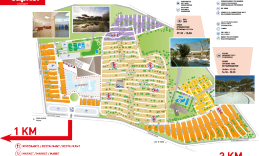 Het kampeerterrein is ruim 26 hectare groot, in een beschermd pijnbomenbos. De mix van respect voor de natuur met het modernste comfort is overal op de camping terug te zien. De mobile homes en kampeerplaatsen zijn zo ingericht dat ze aan alle hedendaagse vakantiewensen voldoen.