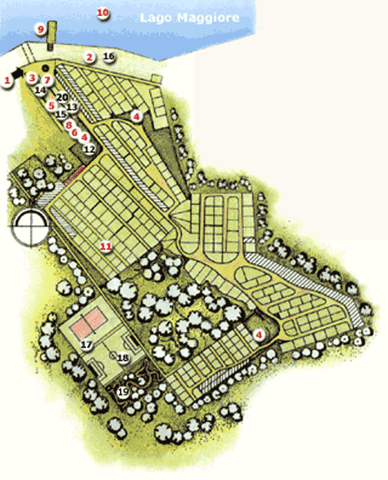 De ruime camping heeft beschikking over 200 schaduwrijke kampeerplaatsen (met elektra) op het gras, en comfortabele mobile homes met gemeubileerde veranda en een parkeerplaats. Een deel van de kampeerplaatsen liggen direct aan het Lago Maggiore.