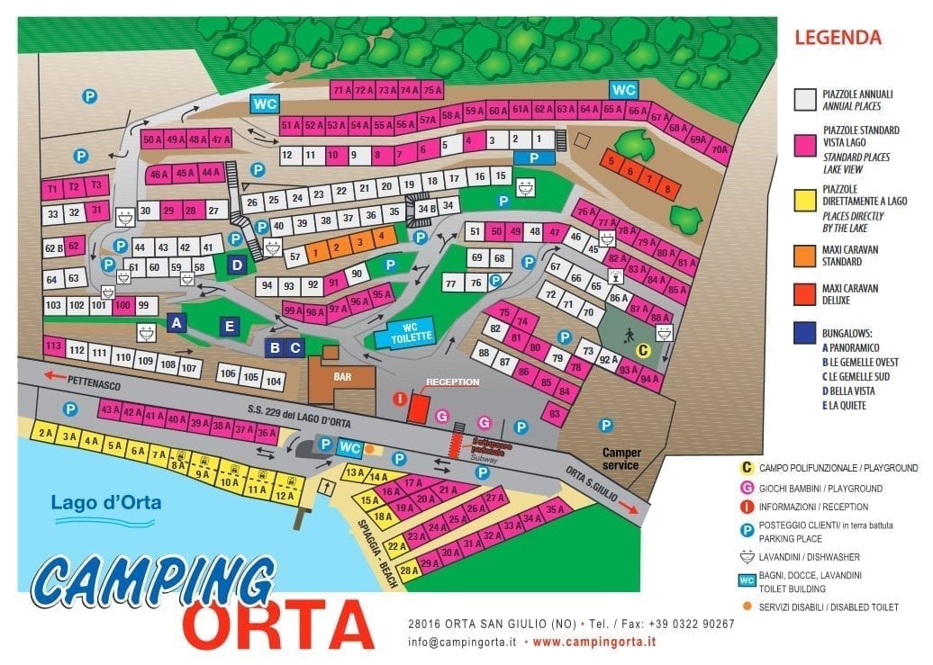 Het verzorgde kampeerterrein kent 2 soorten kampeerplaatsen, de standaard staanplaatsen en plekken direct aan het Lago d’Orta. De sanitaire voorzieningen zijn ruim en modern. Daarnaast is het mogelijk om op deze kleine camping volledig uitgeruste mobile homes en moderne bungalows met uitzicht op het meer en de omringende bergen te huren.