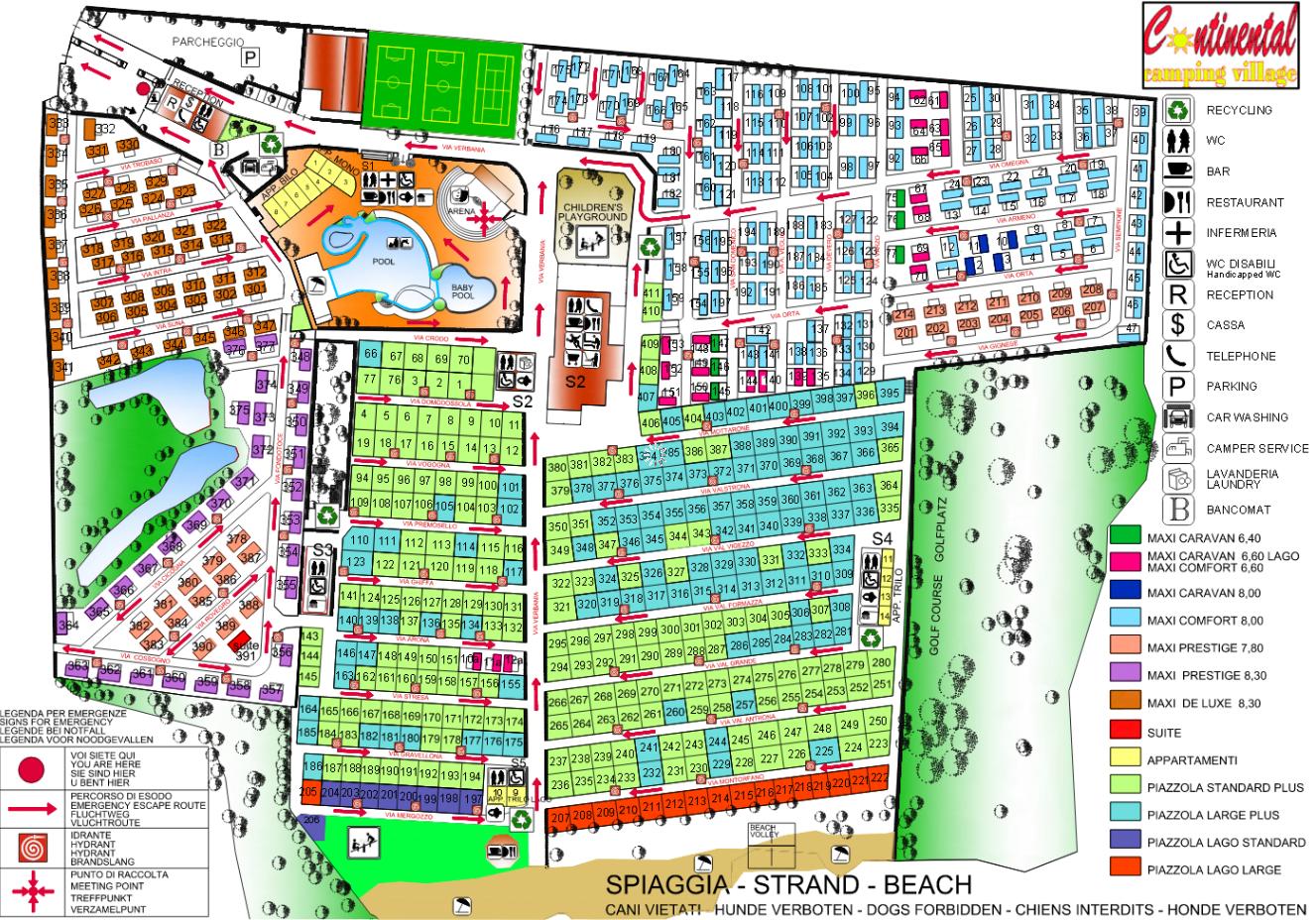 Voor gasten van de grote familiecamping Continental zijn er op het 100.000 m2 grootte kampeerterrein schaduwrijke ruime staanplaatsen, speciale staanplaatsen in de zone bij meer (80-94 m2), extra large staanplaatsen ( 95-105 m2) en standaard plaatsen (70-79 m2), allen 338 plaatsen met elektra (6 amp.), satelliet-TV aansluiting, watertoe- en afvoer en op gras. Er is ook camperservice, autowasgelegenheid en een wasserette.