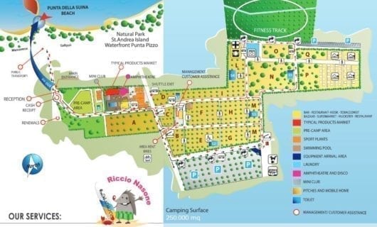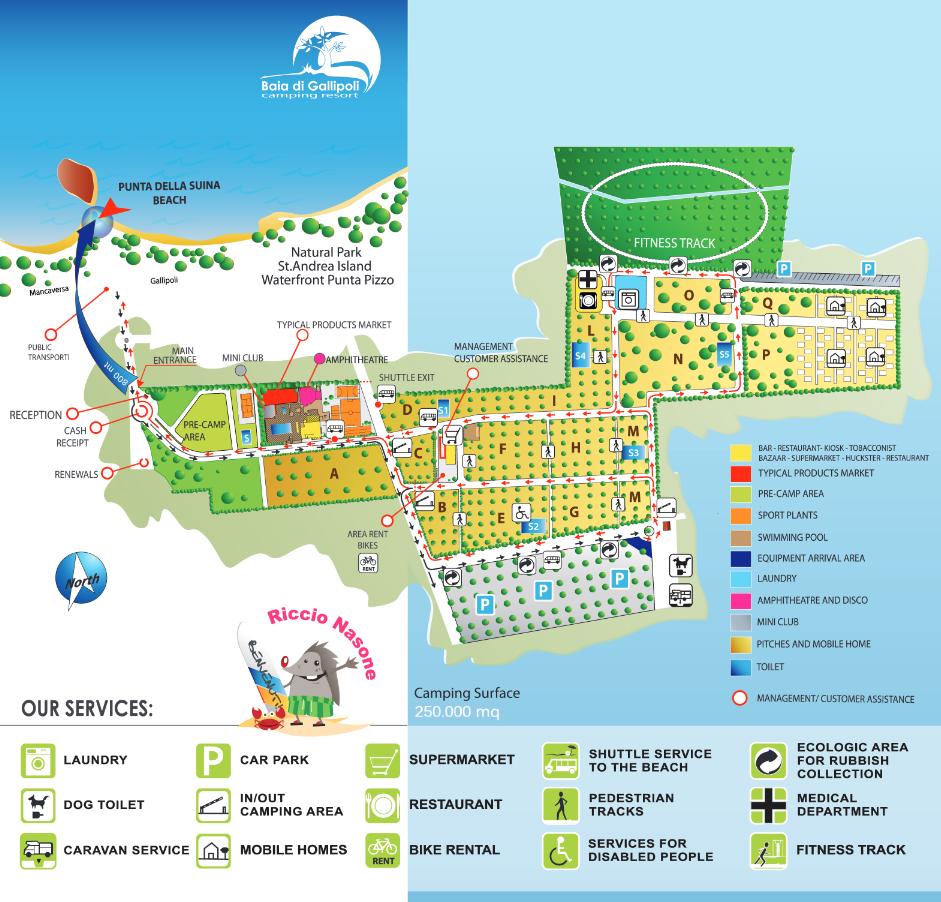 De camping is dichtbij de zee gelegen (800 meter) op slechts 4 kilometer ten zuiden van Gallipoli, in het natuurpark van Punta Pizzo. De camping heeft een prachtig uitzicht op de baai van Gallipoli, met een blauw kader van de zee. Geschikt voor gezinnen, jong en oud die volledig tot rust willen komen.
