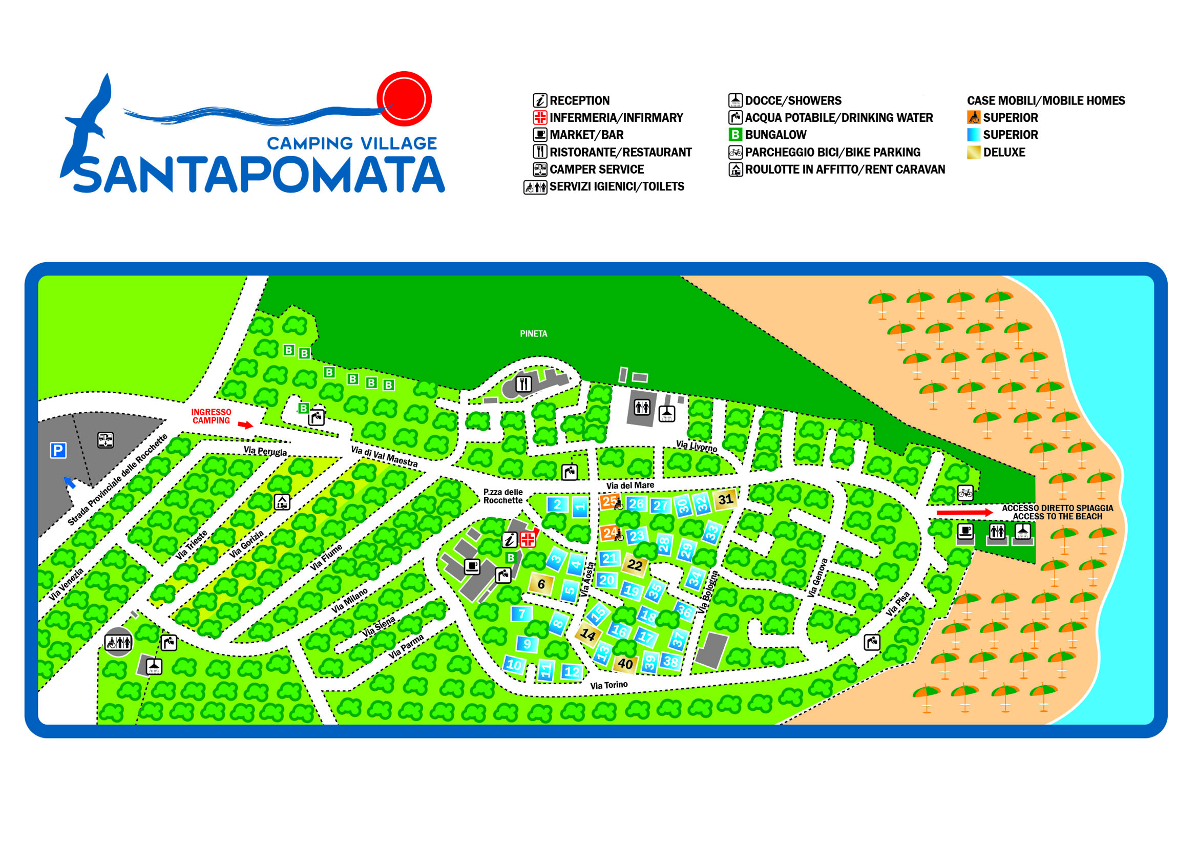 Camping Santapomata is gelegen in Rocchette, ingebed in een prachtig pijnbomenbos direct aan het zandstrand in Toscane. De camping bevindt zich op slechts 5 kilometer afstand van Castiglione della Pescaia dat in het hart van de Toscaanse Maremma ligt. Een ideale plek om te genieten van een vakantie met familie of vrienden met vele mogelijkheden voor een rustige en ontspannen vakantie.De camping ligt uniek aan een prachtig breed zandstrand en is daarom zeer geschikt voor zonaanbidders van alle leeftijden.