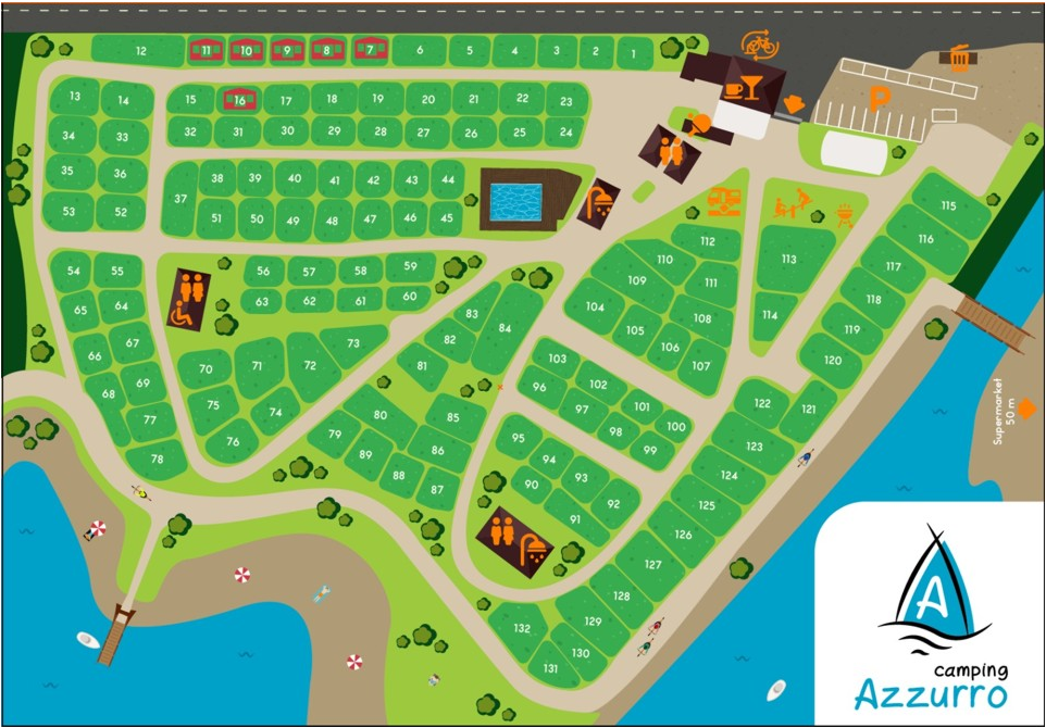 Op het vlakke kampeerterrein bevinden zich 120 ruime staanplaatsen met lichtaansluiting en een aantal zijn volledig uitgerust. Loofbomen zorgen voor schaduw. Op Camping Azzurro vindt u een bar voor snacks, drankjes en ontbijt in een huiselijke, vriendelijke en professionele sfeer.