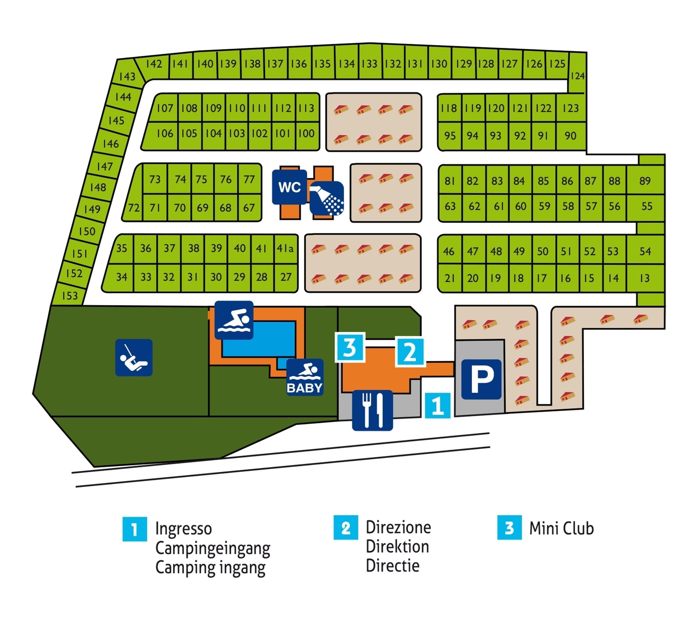 Deze camping heeft 153 kampeerplaatsen met een grootte van 80 m2 en weinig tot geen beschutting. Bij de kampeerplekken is het toiletgebouw in het midden van al de plaatsen gelegen. U hoeft uw eigen fiets niet mee te nemen, deze kan gehuurd worden. Op Camping San Cristoforo zijn er twee verschillende types mobile homes, ze variëren in grootte van 24m²en 32m². Ze zijn geschikt voor maximaal 6 of 7 personen. Ook kunt u op de camping een ingerichte tent huren van 25m², deze is geschikt voor 6 personen.
