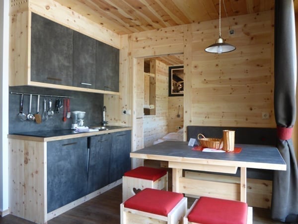 De houten lodges (chalets) op de camping zijn uitgerust met twee slaapkamers, elk met douche en toilet en bieden voldoende ruimte voor een gezin met 5 personen. Daarnaast hebben ze een woonkamer met een bank en een zonneterras met een prachtig uitzicht op de Dolomieten. Alternatief zijn de houten eco tenten.