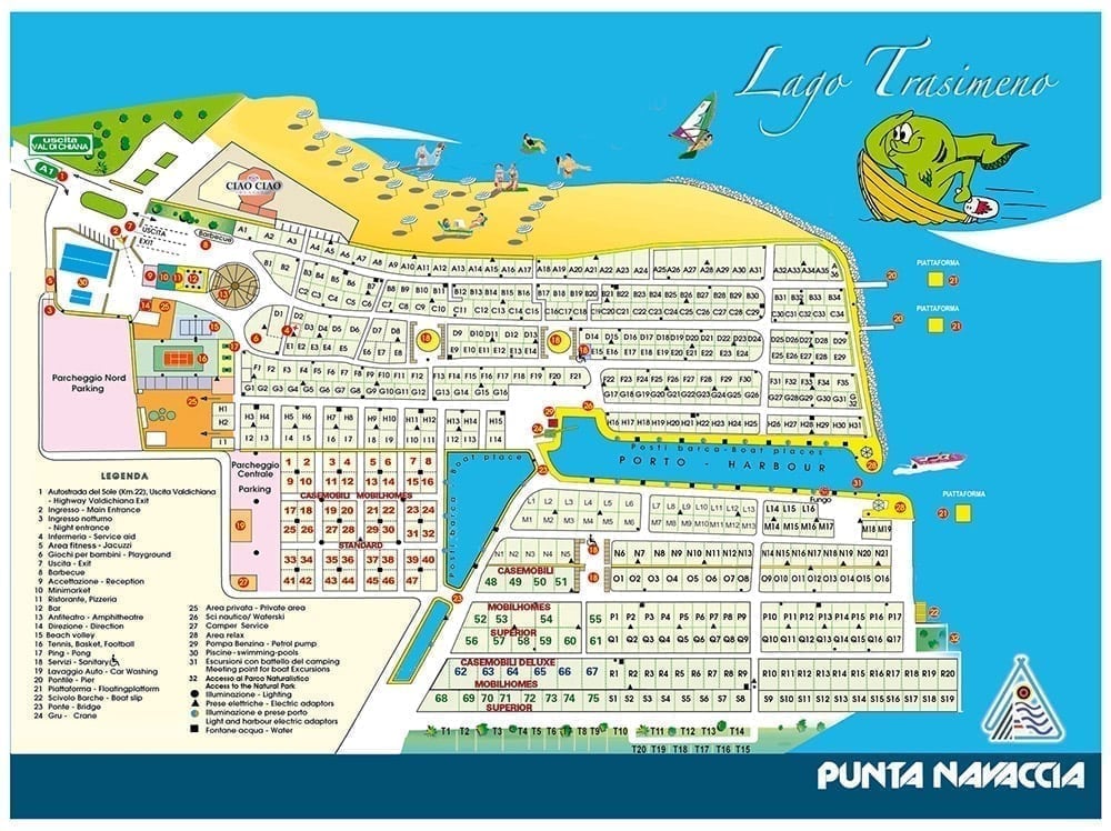 Camping Punta Navaccia ligt in het plaatsje Tuoro sul Trasimeno in Umbria. De camping ligt direct aan het Trasimenomeer en is de perfecte camping voor een ontspannen vakantie. Het is een zeer kindvriendelijke camping en het is er altijd gezellig druk. Er is veel te doen op de camping en in de omgeving.