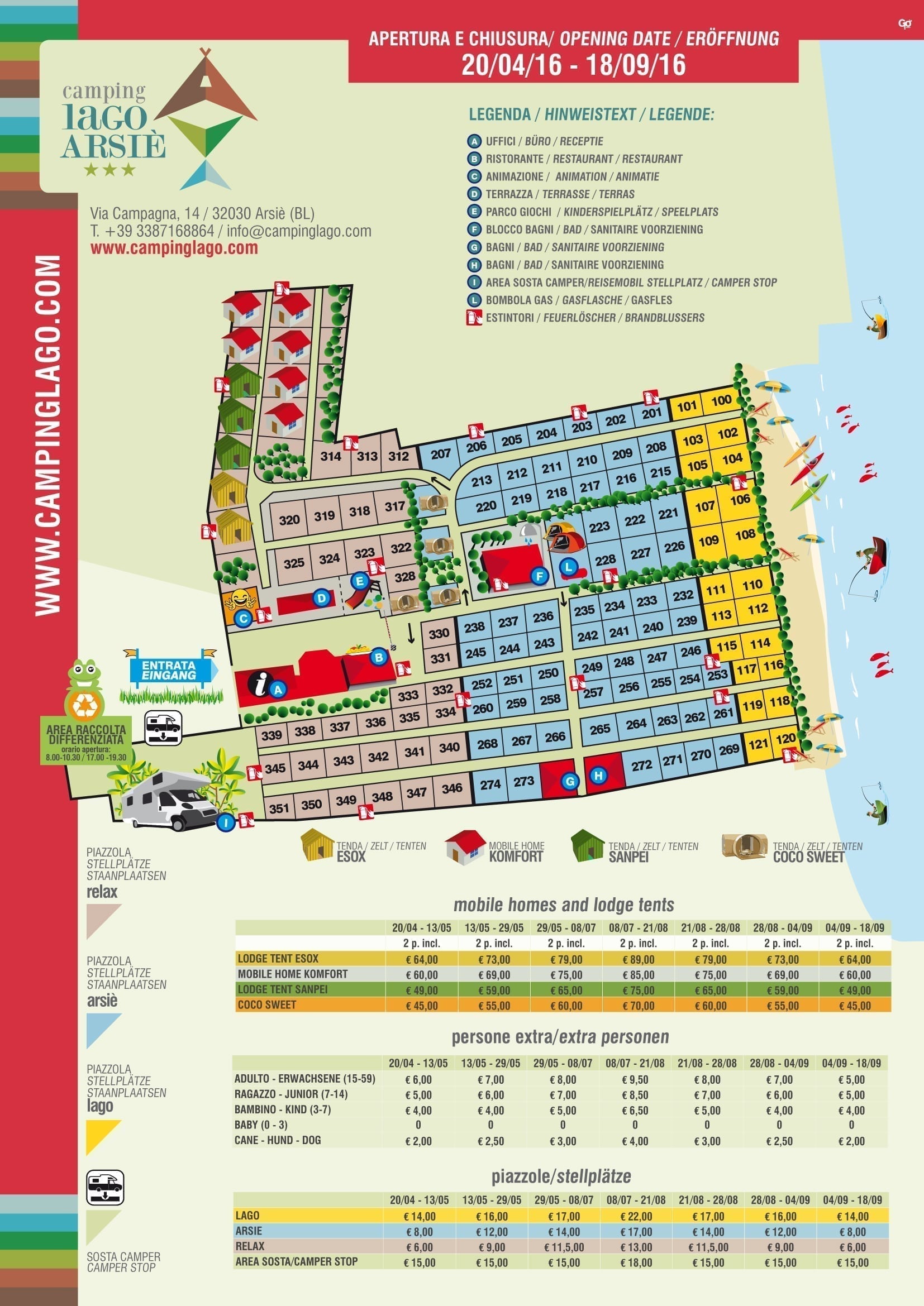 De camping heeft kampeerplaatsen op een vlak, rechthoekig terrein met en zonder schaduw. Deze plaatsen hebben een schitterend uitzicht op de omliggende bergen. Lago Arsiè biedt u ook de mogelijkheid tot het huren van tenten en stacaravans. Er zijn 2 verschillende soorten stacaravans, beide zijn ze volledig ingericht, het verschil is dat bij de één wel honden zijn toegestaan en bij de ander niet. De stacaravans zijn geschikt voor 6 of 7 personen