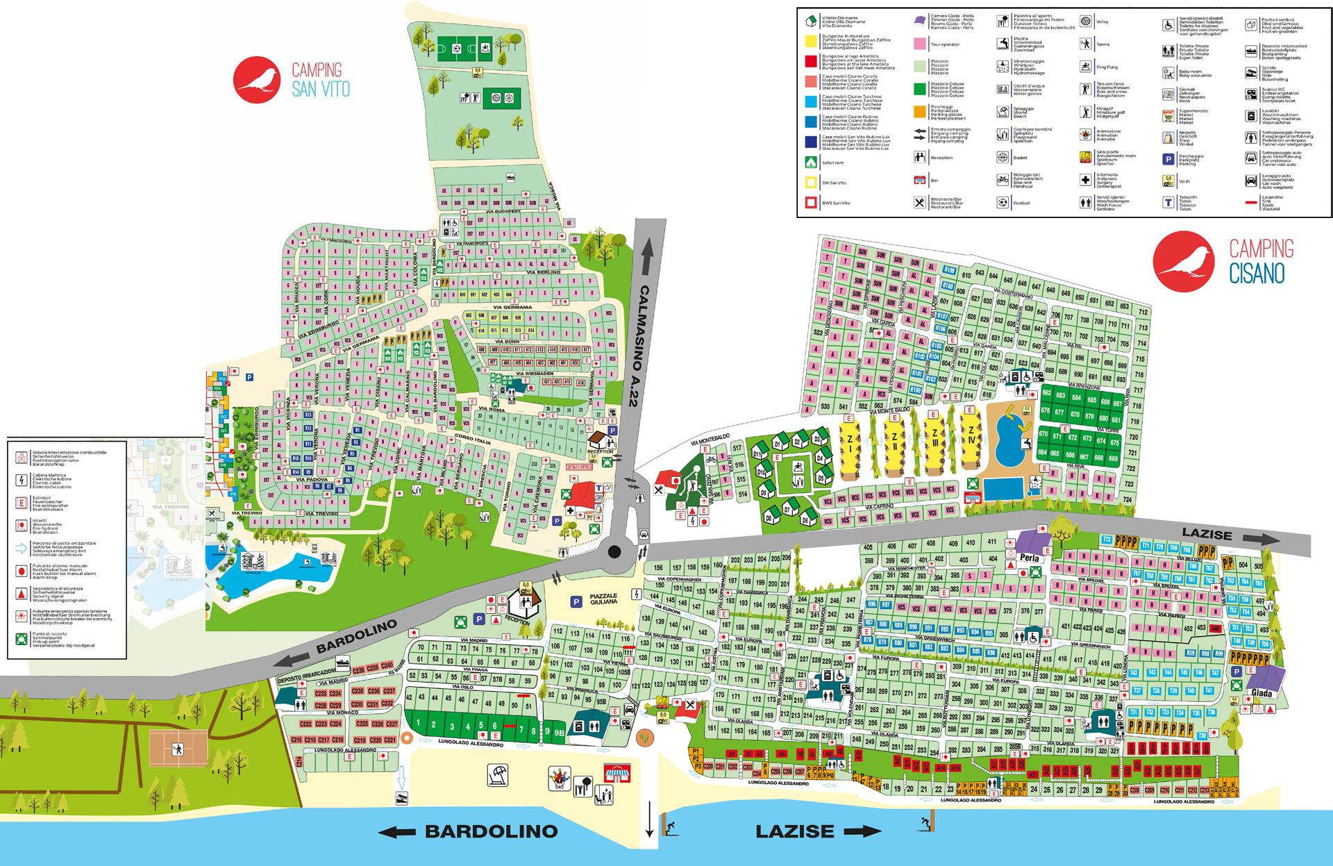 Camping Cisano – San Vito ligt tussen de belangrijke toeristische plaatsen aan de oostkant van het Gardameer, Bardolino, Garda en Lazise (Veneto) direct aan het meer en is erg geschikt voor gezinnen. De camping beschikt over vele faciliteiten en heeft zelfs een privé zandstrand.
