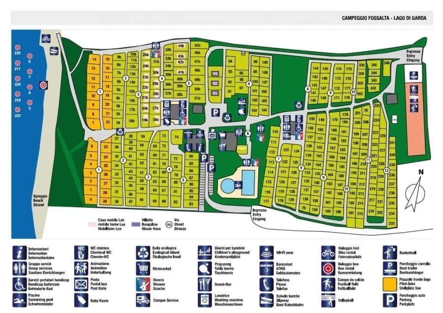 De camping heeft afgebakende kampeerplaatsen, veel plaatsen liggen deels in de de schaduw en deels in de zon. Het strand van het Gardameer bij camping Fossalta bestaat uit een gedeelte van zand en grind. Behalve kamperen heeft u ook de mogelijkheid om een stacaravan of bungalow te huren.