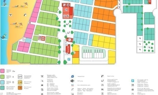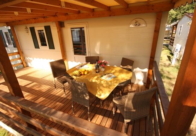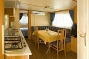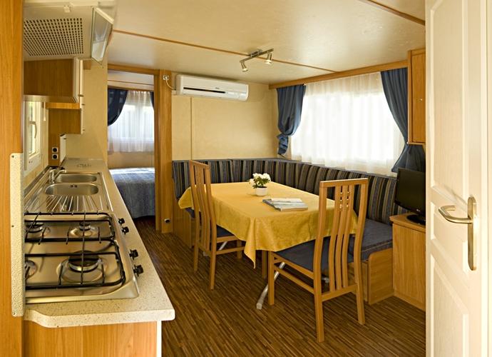 De appartementen op de camping zijn eigenlijk kleine villa’s, bestaande uit twee verdiepingen met een totale oppervlakte van zo’n 75 m2. De mobile homes hebben een tweepersoons slaapkamer, badkamer en volledig ingerichte kitchenette. Deze camping heeft zonnige kampeerplaatsen op het gras, alle voorzien van elektra en waterpunt.