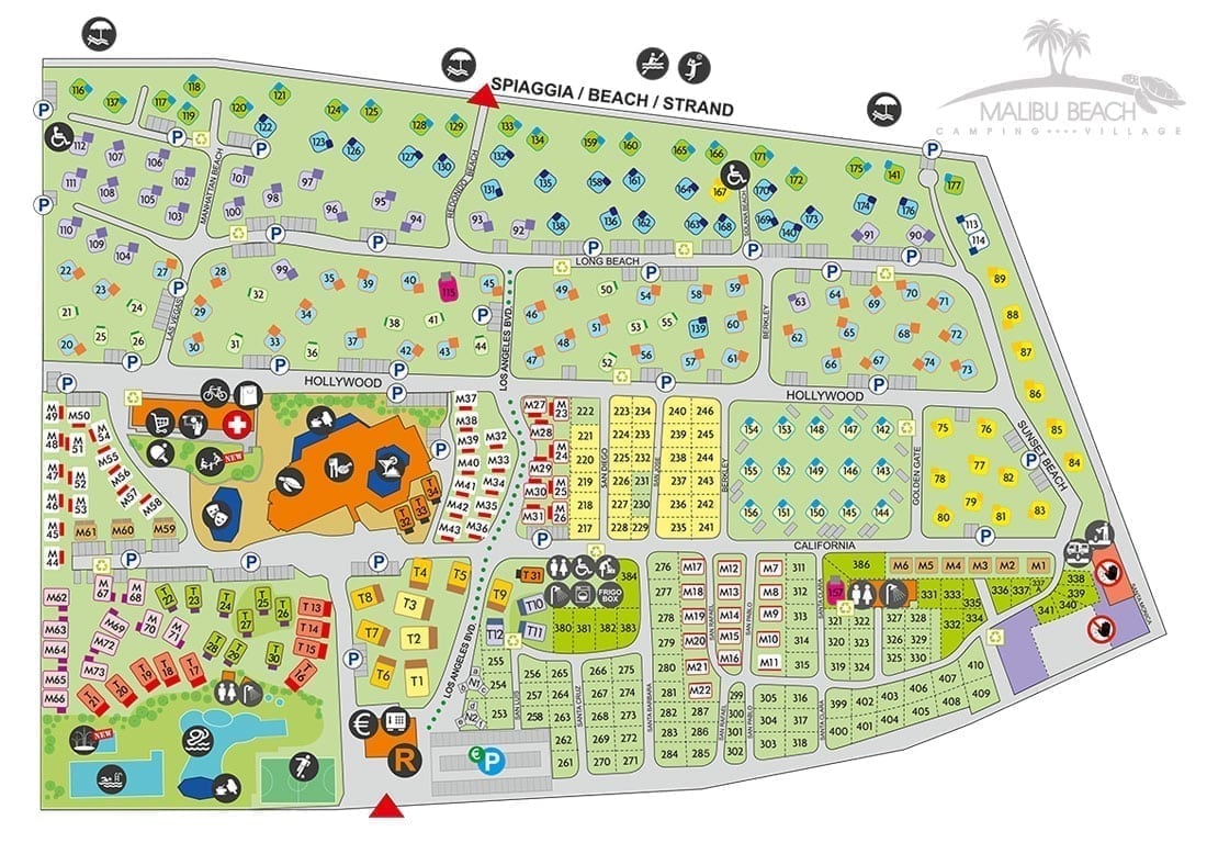 Camping Malibu Beach is een vakantiedorp midden in het groen, in een pijnboombos met een oppervlakte van 100.000 m2 meteen aan zee. Een ideale plek voor een vakantie in het teken van ontspanning en vermaak. Dit is een ideale positie voor families met kleine kinderen, een waar paradijs. Er zijn namelijk geen gevaarlijke wegen met verkeer.