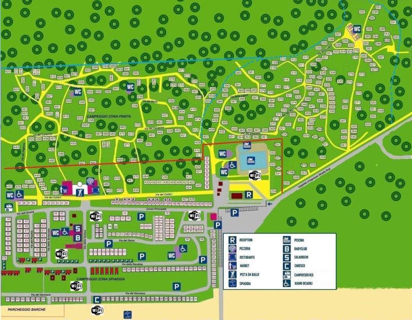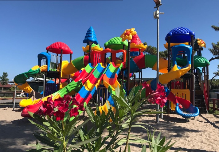 Er is een supermarkt en een restaurant-pizzeria met uitgebreide bar. Op de camping hebben de gasten tevens de beschikking over een groot nieuw zwembad voor volwassenen en een wat kleiner bad voor de kinderen. Het zeer brede en langzaam aflopende strand is alleen toegankelijk voor de gasten van de camping. Hierbij is er een vrije zone maar zijn er ook ligbedden en parasols. Tevens is er een kiosk annex bar aan het strand.
